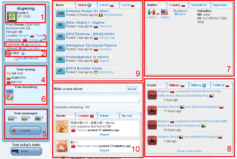 Activities in this game are divided into several modules. First is the economy as a citizen in a country of your choice you must work to earn money, which you will get to spend for example, on food or purchase of weapons which are critical for your progress as a fighter. You will work in either private companies which are owned by players or government companies which are owned by the state. After progressing in the game you will finally get the opportunity to set up your own business and hire other players. If it prospers, we can even change it into a joint-stock company and enter the stock market and get even more money in this way.