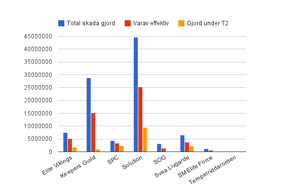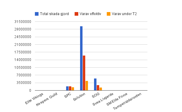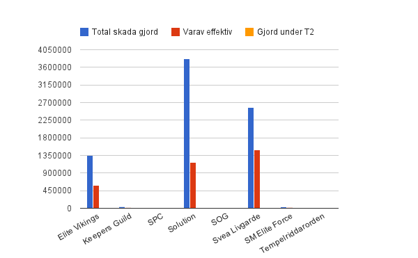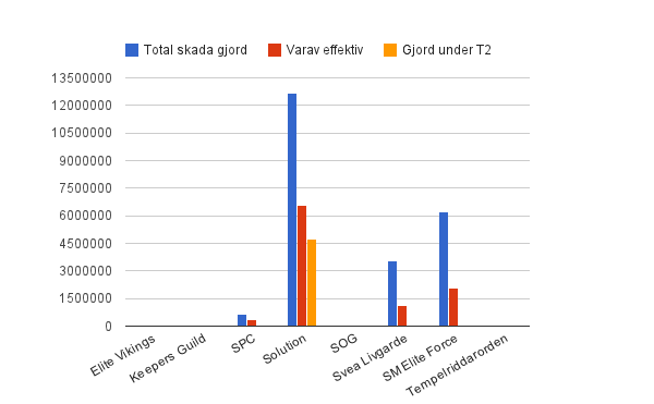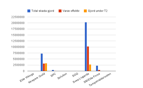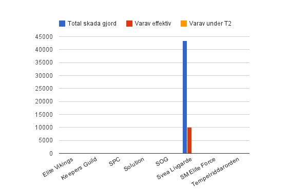 Staplarna avser total skada gjord, uppdelad på MUs. BLÅTT fält visar total skada gjord. RÖTT fält visar mängd effektiv skada gjord och det ORANGEA fältet visar mängden skada som gjordes under T2 (varje omgångs sista två minuter). Om inga röda fält finns, gjordes ingen effektiv skada och samma sak med orangea avseende T2-skada.