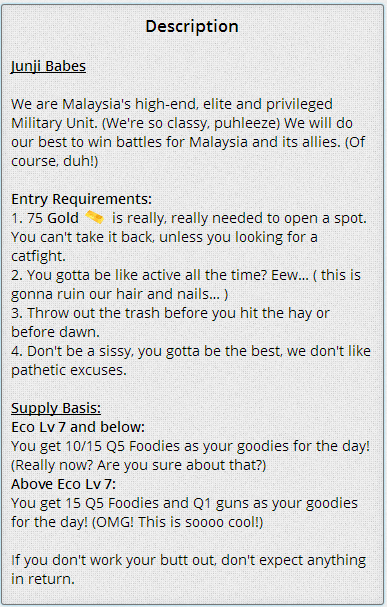 Activities in this game are divided into several modules. First is the economy as a citizen in a country of your choice you must work to earn money, which you will get to spend for example, on food or purchase of weapons which are critical for your progress as a fighter. You will work in either private companies which are owned by players or government companies which are owned by the state. After progressing in the game you will finally get the opportunity to set up your own business and hire other players. If it prospers, we can even change it into a joint-stock company and enter the stock market and get even more money in this way.