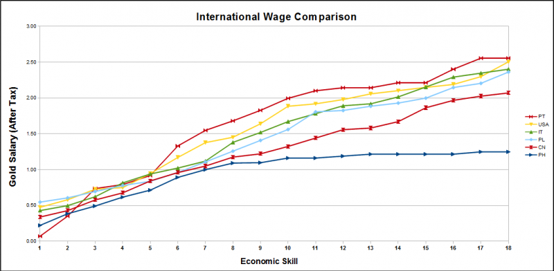 The following chart shows a comparison of wages in these six countries, subtracting income tax, and converting the wage to Gold. All wage and tax rate data was collected during Day 856.