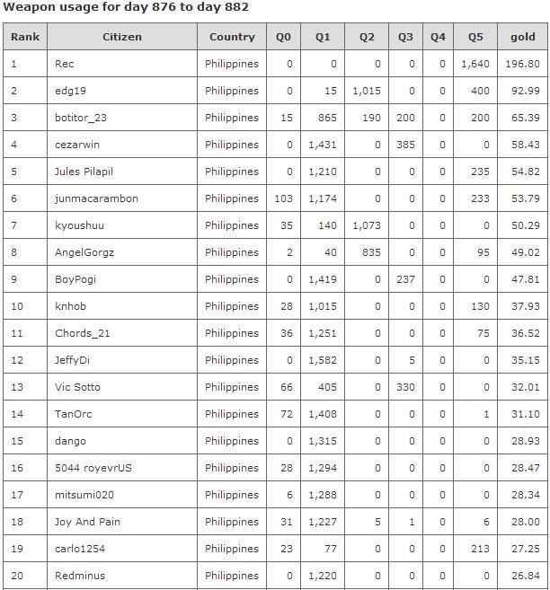 Lets get it on! The first table shows weapon usage in days 876-882.