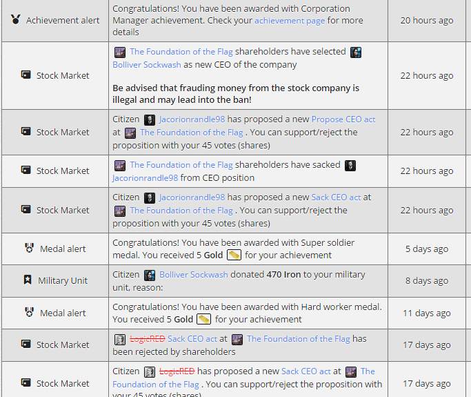 Activities in this game are divided into several modules. First is the economy as a citizen in a country of your choice you must work to earn money, which you will get to spend for example, on food or purchase of weapons which are critical for your progress as a fighter. You will work in either private companies which are owned by players or government companies which are owned by the state. After progressing in the game you will finally get the opportunity to set up your own business and hire other players. If it prospers, we can even change it into a joint-stock company and enter the stock market and get even more money in this way.