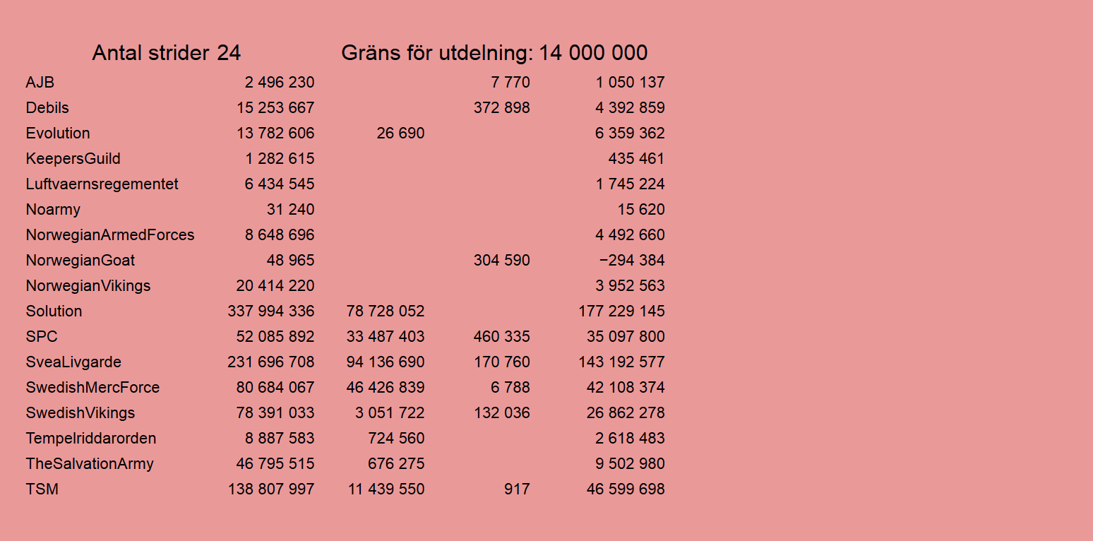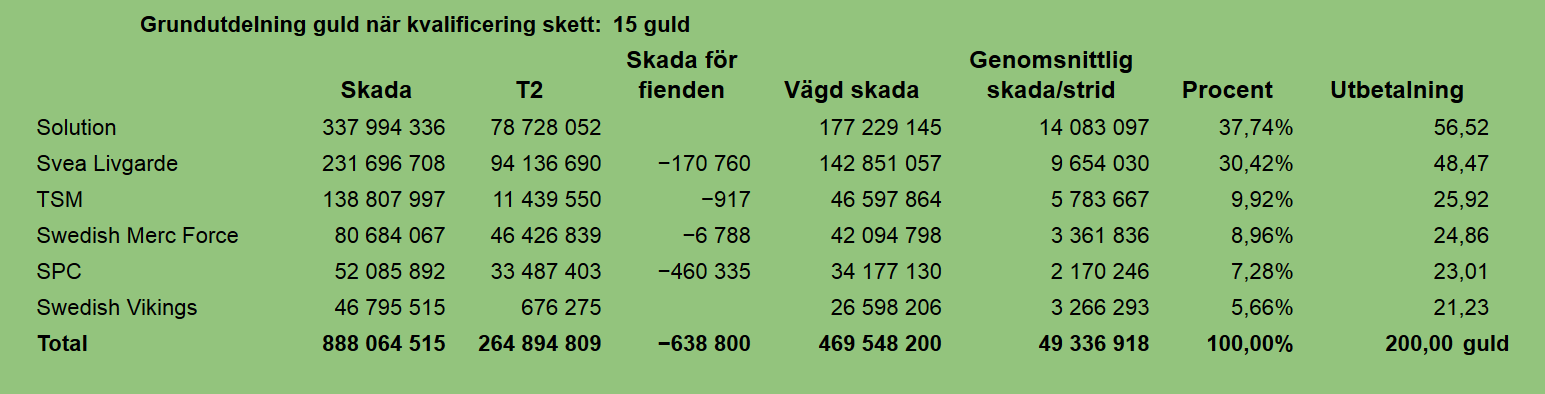Kravet på MUs för kvalificering i utdelningen är minst 14 miljoner vägd skada, alltså 2 miljoner skada per dag och även denna gång klarade 6 MUs denna gräns. Beloppet som delas ut för en full vecka och följaktligen då 200 guld.