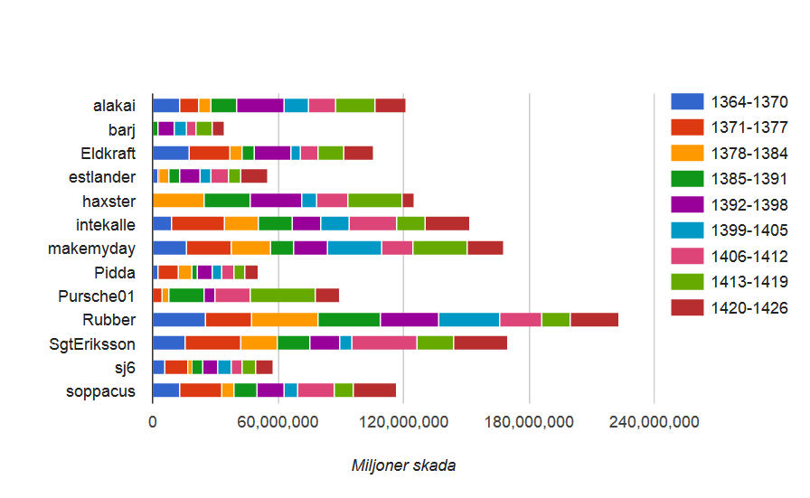 Soppacus är annars med sina c:a 116,6 miljoner dmg den som ligger närmast genomsnittsskadan på 113 miljoner, sett över hela perioden. Ser man dock till utdelningarna så borde snittet vara 68 - 72 miljoner skada, om man alltså inte slagit på boostdagar eller satsat eget guld och då ligger sj6 närmast med sina nästan 58 miljoner.