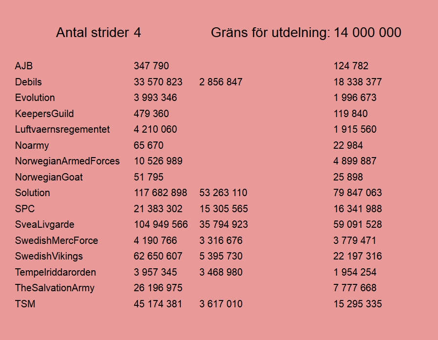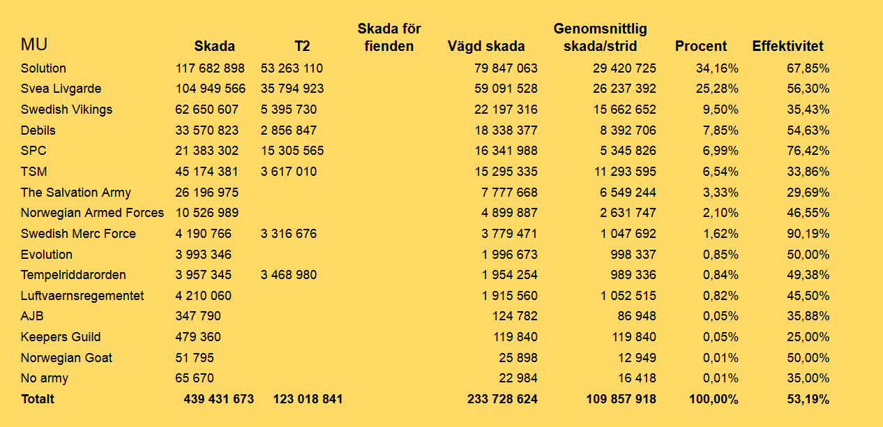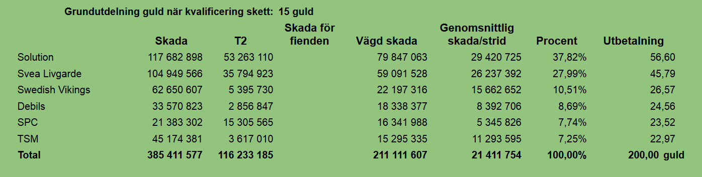 Kravet på MUs för kvalificering i utdelningen är minst 14 miljoner vägd skada, alltså 2 miljoner skada per dag i snitt och även denna gång klarade 6 MUs gränsen. För första gången kvalificerade sig nu en norsk MU och vi gratulerar dem såklart till denna framgång. Beloppet som delas ut är för en full vecka och följaktligen då 200 guld.