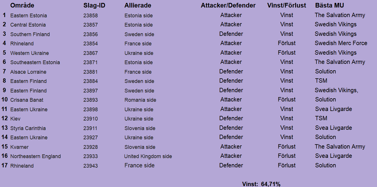 Här en lista över de krig som ingått, hur de slutade samt bästa svenska MU på plats.
