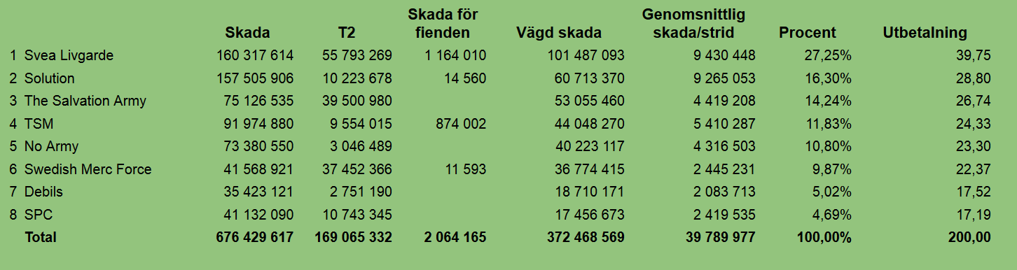 Kravet på MUs för kvalificering i utdelningen är minst 14 miljoner vägd skada, alltså 2 miljoner skada per dag i snitt och denna gång klarade hela 8 MUs gränsen. Beloppet som delas ut är som vanligt 200 guld.