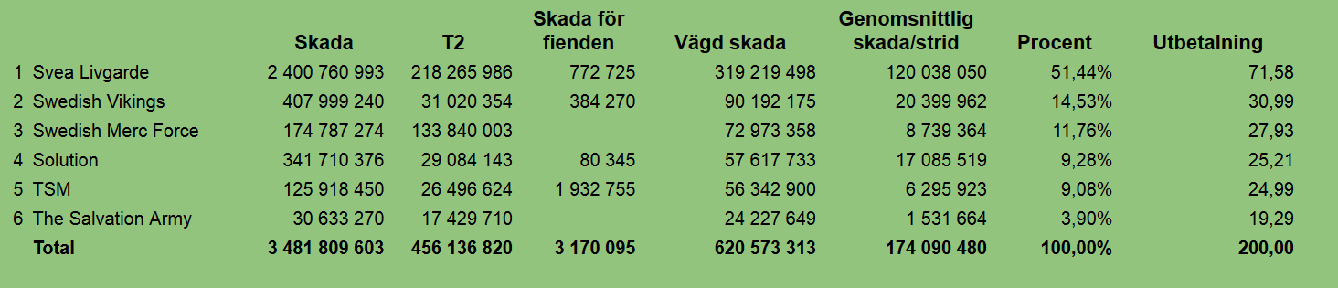 Kravet på MUs för kvalificering i utdelningen är minst 14 miljoner vägd skada, alltså 2 miljoner skada per dag i snitt och denna gång klarade endast 6 MUs gränsen. Beloppet som delas ut är som vanligt 200 guld.