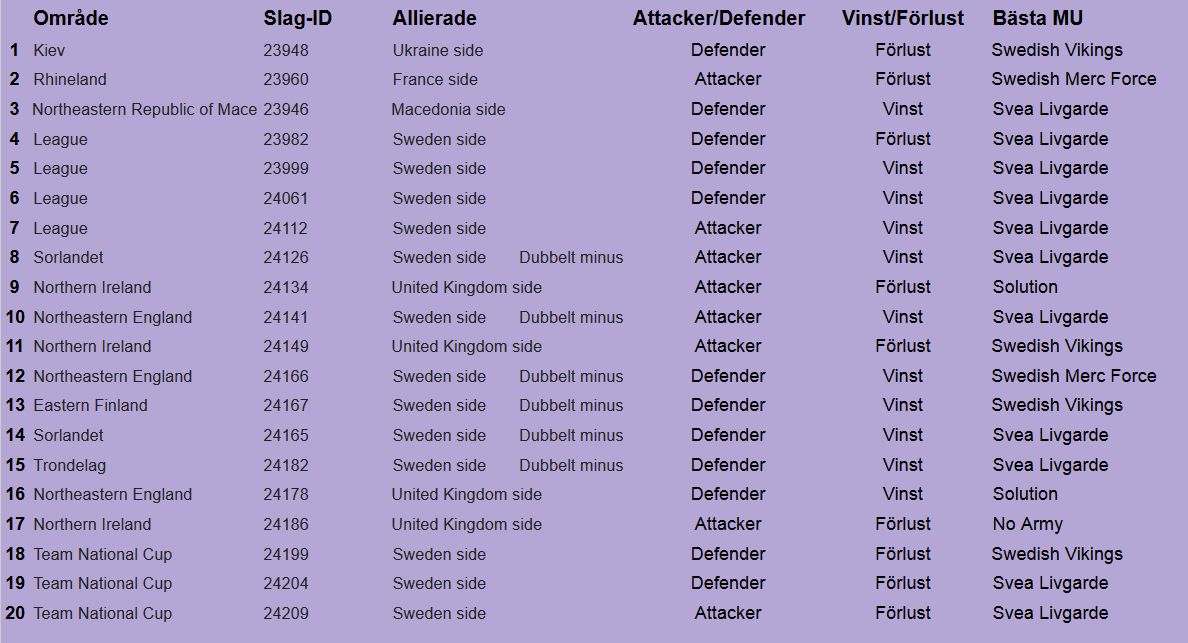 Här en lista över de krig som ingått, hur de slutade samt bästa svenska MU på plats.