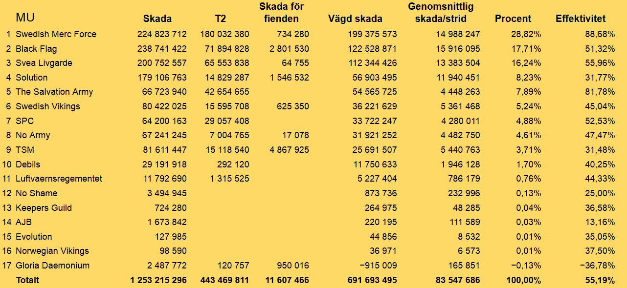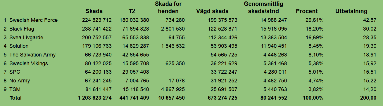 Kravet på MUs för kvalificering i utdelningen är minst 14 miljoner vägd skada, alltså 2 miljoner skada per dag i snitt och denna gång klarade hela 9 MUs gränsen. Beloppet som delas ut är som vanligt 200 guld.