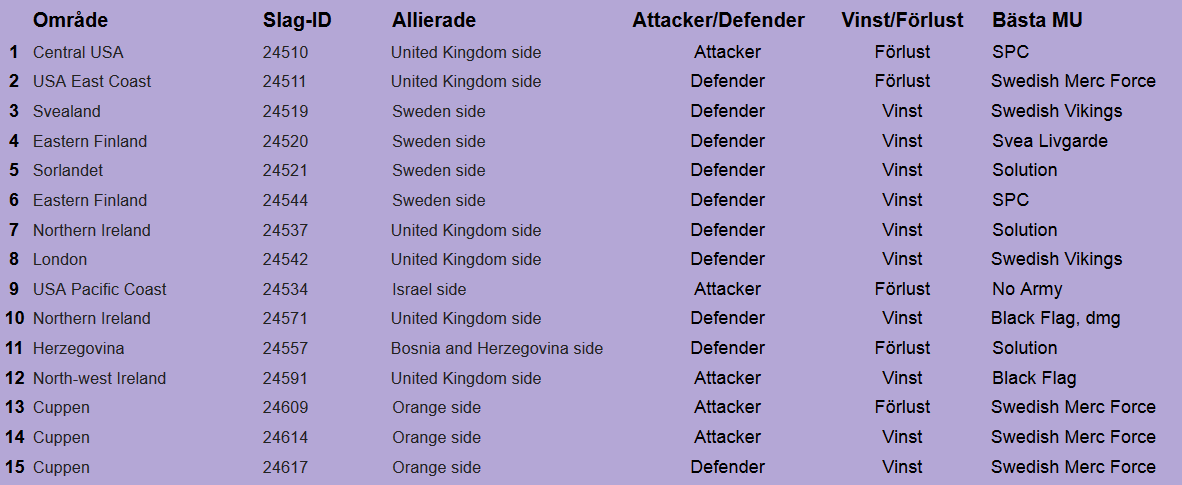 Här en lista över de krig som ingått, hur de slutade samt bästa svenska MU på plats.