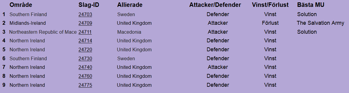 Här en lista över de krig som ingått, hur de slutade samt bästa svenska MU på plats.
