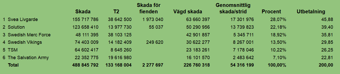 Kravet på MUs för kvalificering i utdelningen är minst 14 miljoner vägd skada, alltså 2 miljoner skada per dag i snitt och denna gång klarade 6 MUs gränsen. Beloppet som delas ut är som vanligt 200 guld.