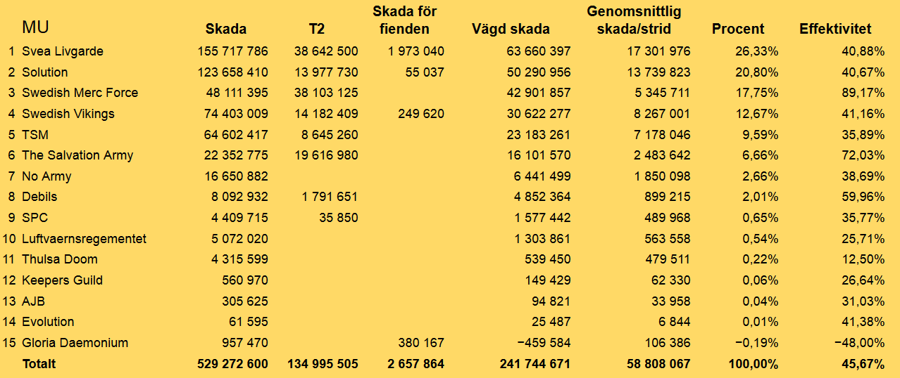 Så var det dags för ännu en MU utdelning. Även denna vecka var det lite färre strider strider som kunde medräknas, men som sist ändå nio stycken . Vi har i dessa stider sammanlagt gjort över 500 miljoner skada.