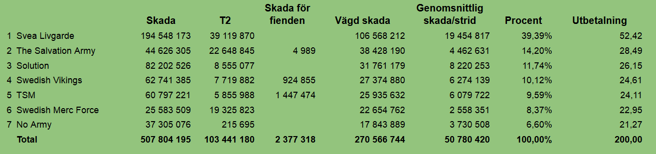 Kravet på MUs för kvalificering i utdelningen är minst 14 miljoner vägd skada, alltså 2 miljoner skada per dag i snitt och denna gång klarade 7 MUs gränsen. Beloppet som delas ut är som vanligt 200 guld.