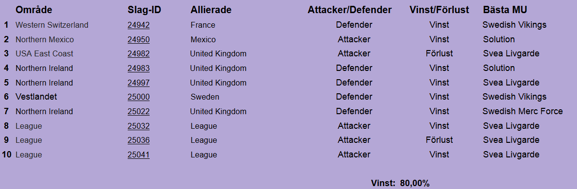 Här en lista över de krig som ingått, hur de slutade samt bästa svenska MU på plats.