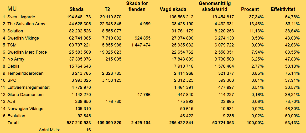 Så var det dags för ännu en MU utdelning. Denna vecka var det tio strider som kunde medräknas, en fler än det var veckorna innan . Vi har i dessa stider sammanlagt gjort över 500 miljoner skada.