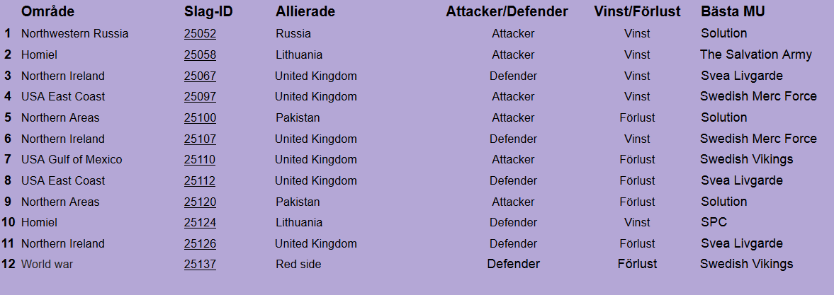 Här en lista över de krig som ingått, hur de slutade samt bästa svenska MU på plats.