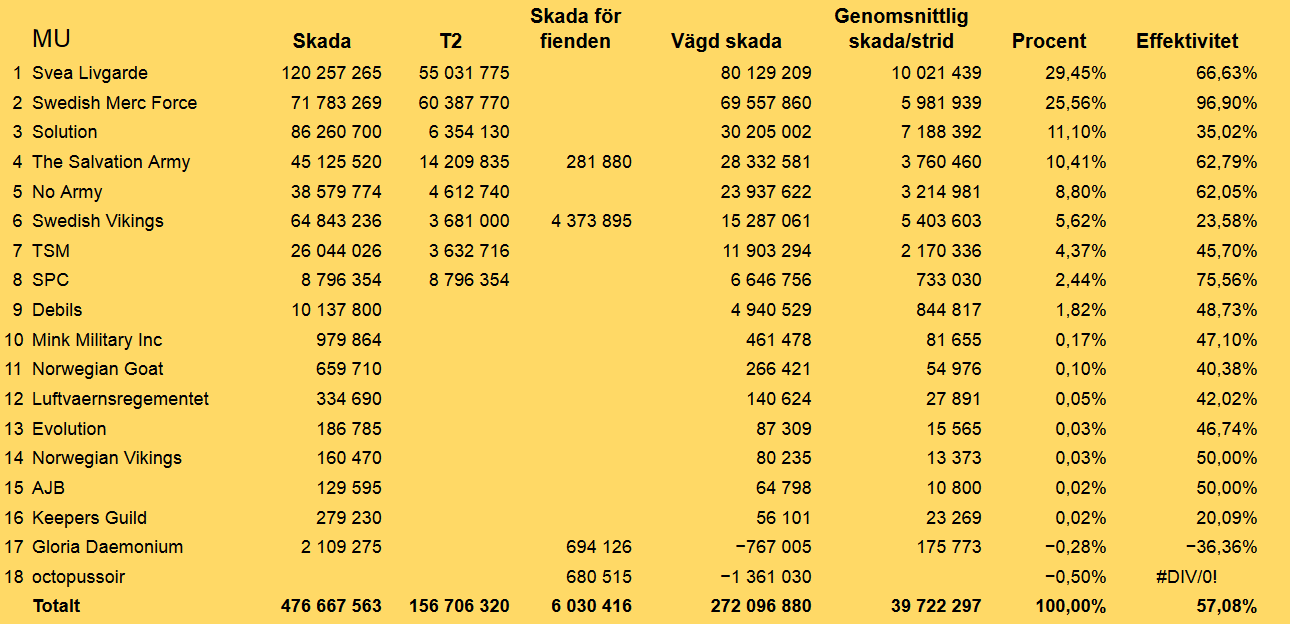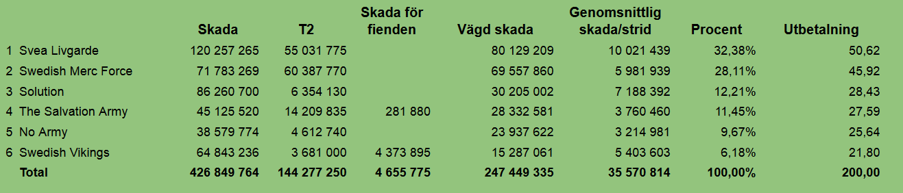 Kravet på MUs för kvalificering i utdelningen är minst 14 miljoner vägd skada, alltså 2 miljoner skada per dag i snitt och denna gång klarade 6 MUs gränsen. Beloppet som delas ut är som vanligt 200 guld.