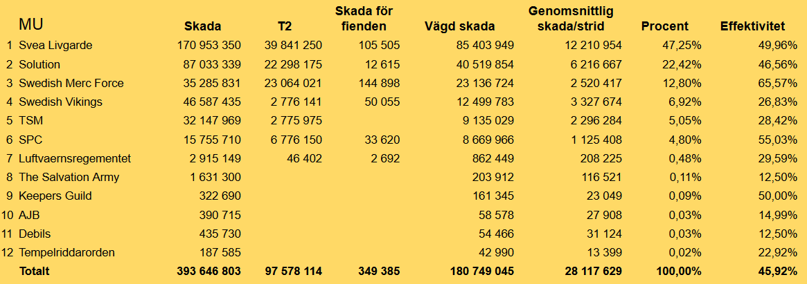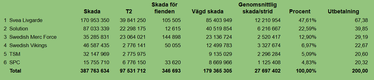 Kravet på MUs för kvalificering i utdelningen är denna vecka sänkt till 7 miljoner vägd skada, alltså 1 miljoner skada per dag i snitt och därför klarade 6 MUs gränsen. Beloppet som delas ut är som vanligt 200 guld.