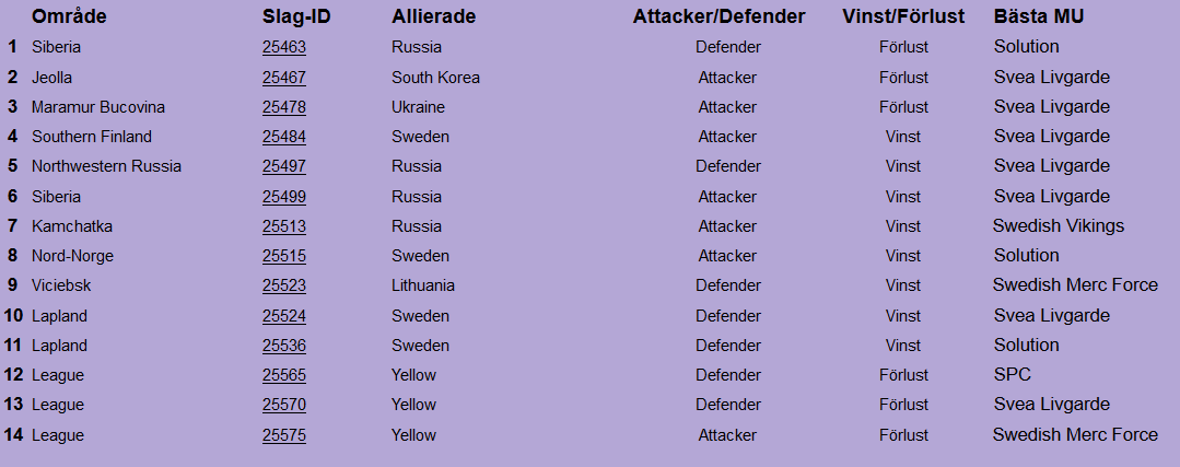 Här en lista över de krig som ingått, hur de slutade samt bästa svenska MU på plats.