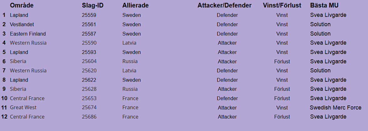 Här en lista över de krig som ingått, hur de slutade samt bästa svenska MU på plats.