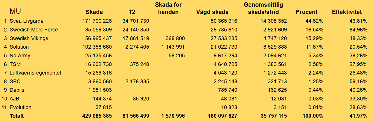 Även denna vecka fick vi sänka kravet på MUs för kvalificering i utdelningen till 7 miljoner vägd skada, alltså 1 miljoner skada per dag i snitt, ändå klarade bara 5 MUs gränsen. Beloppet som delas ut är som vanligt 200 guld.