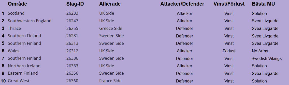 Här en lista över de krig som ingått, hur de slutade samt bästa svenska MU på plats.