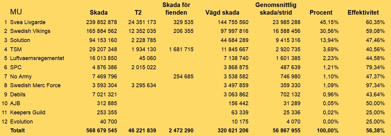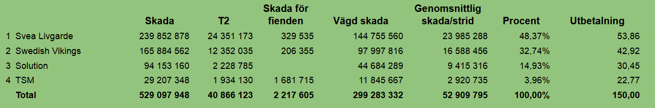 Kravet för kvalificering i utdelningen är pga nämnda strul nedsatt till 10 miljoner vägd skada och denna gång klarade 4 MUs gränsen. Utdelningsbeloppet är även det nedsatt till 150 guld iom 2 dagars mindre krigande.