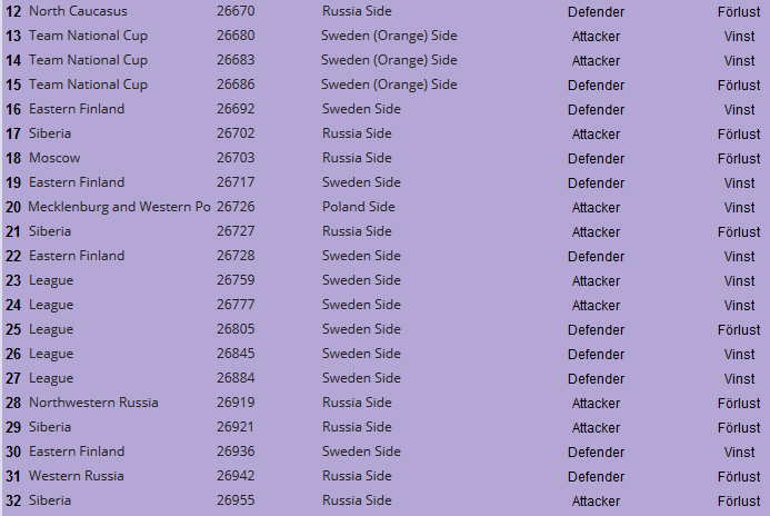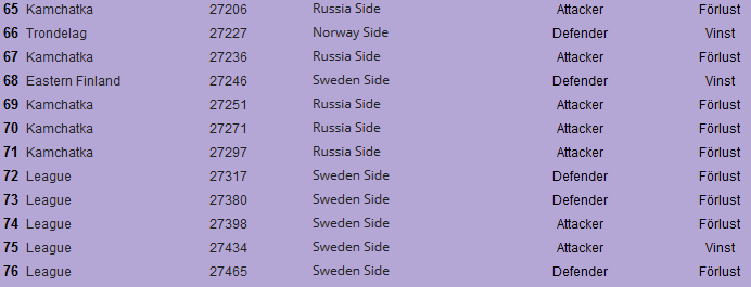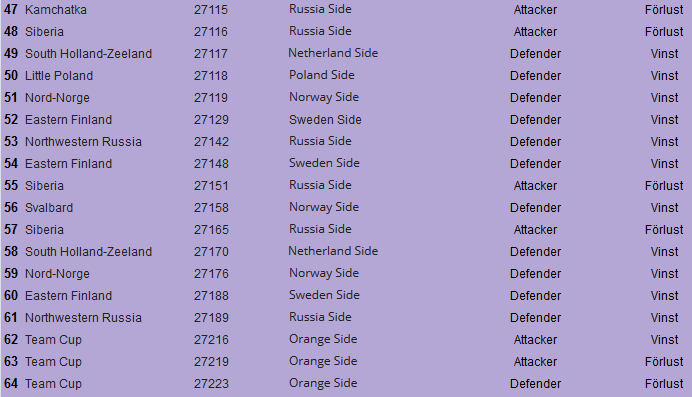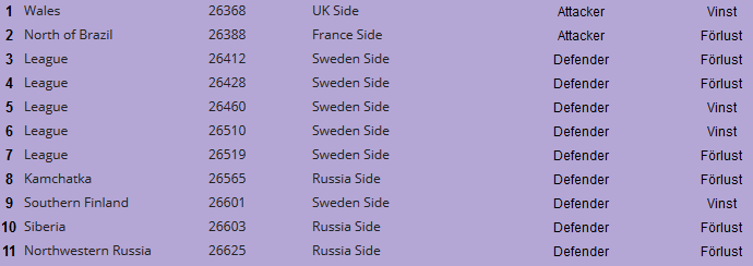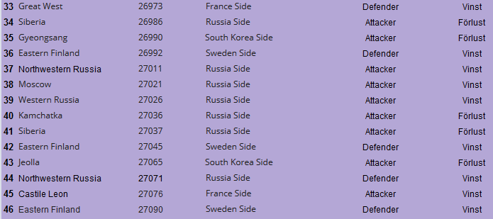 Här en lista vecka för vecka över de krig som ingått i beräkningarna, samt hur de slutade.