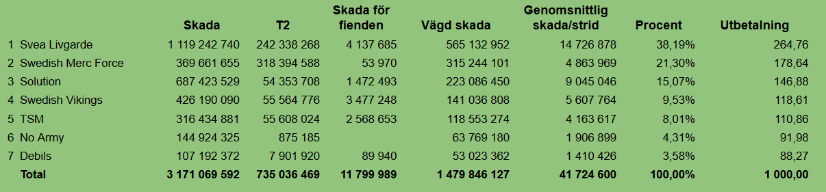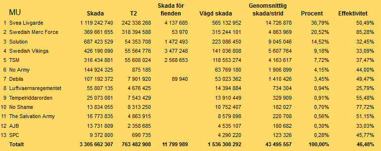 Så var det äntligen dags för MU utdelning igen. Isf att ge fem separata utdelningar, har vi beslutat ge en stor för alla veckor tillsammans. Vi har även sänkt gränsen till 10 miljoner skada per vecka, eftersom jag ofta hållit på ordern ifall det skulle dyka upp RWn i t.ex Finland. Vi har i dessa krig iaf gjort över 3,3 miljarder skada.