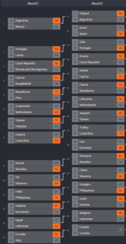 Israel defeated Ukraine in the most voted battle till now(78) and Bulgaria didn't had any problem with beating Indonesia.