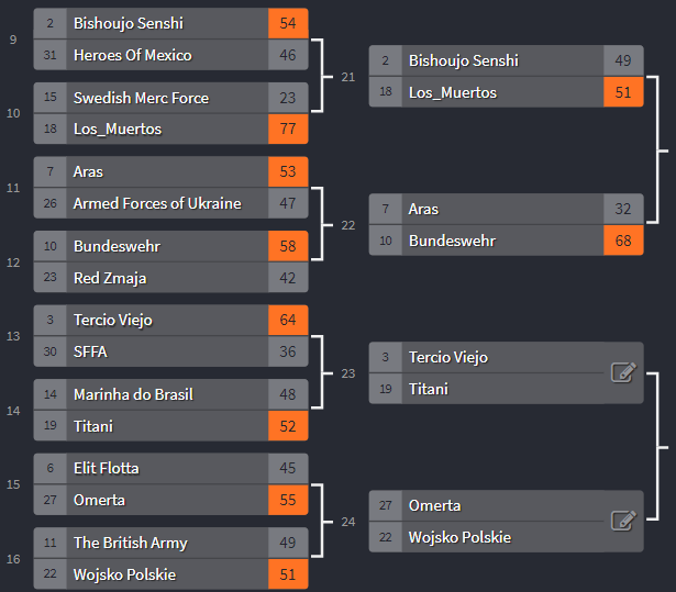 Bundeswehr has won again pretty easily,this time against Aras, and they'll compete against Los Muertos in the next round.