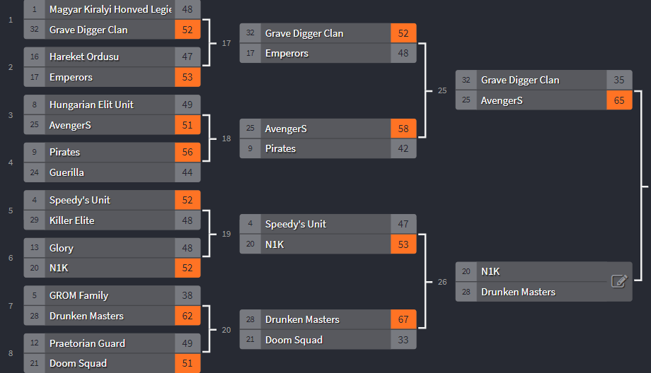 Avengers has won again without a problem.this time against Grave Digger Clan and now we have N1K against Drunken Masters