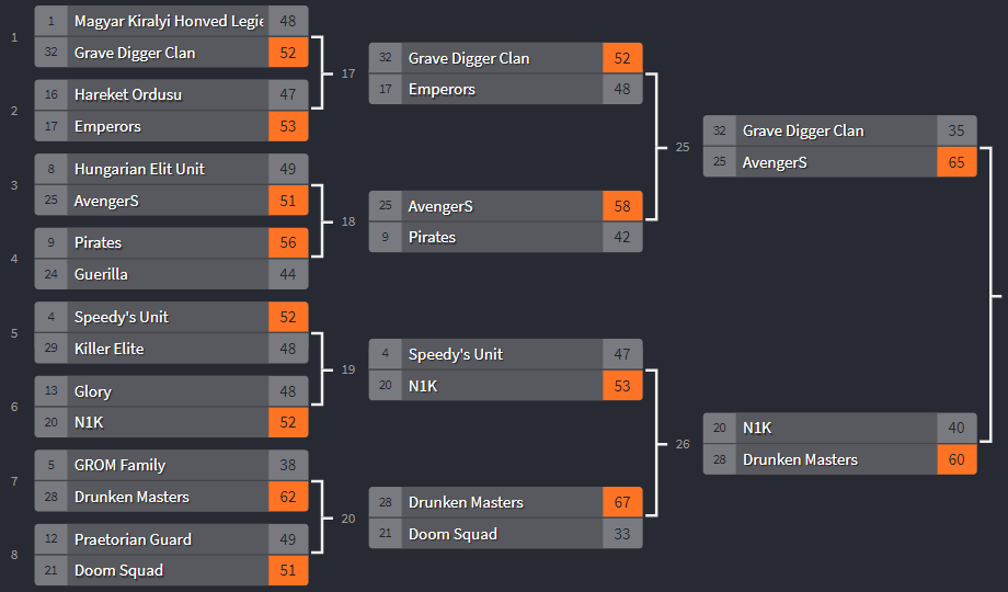 Drunken Masters has won again without any problem and they will compete against Avengers in the semi-finals , now Los Muertos and Bundeswehr are also fighting for a place in the semi-finals.