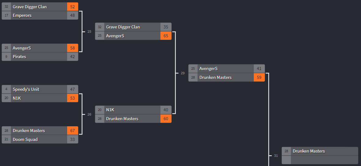 Drunken Masters looks like they don't have an opponent since they've won almost all of their rounds with above 60% of the votes and by that,Avengers goes in the losers-final(for 3rd place) and Drunken Masters in the final.