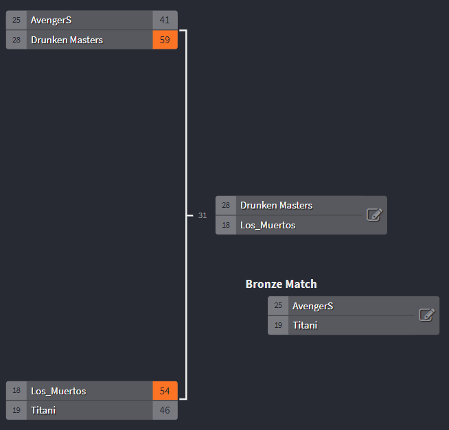 Los Muertos has beaten Titani in a poll with 133 votes and they got a place in the big final.So as a result of that , in the small final AVENGERS is competing against TITANI , tho both of these mu's are national mu's so its basically Italy vs Romania
