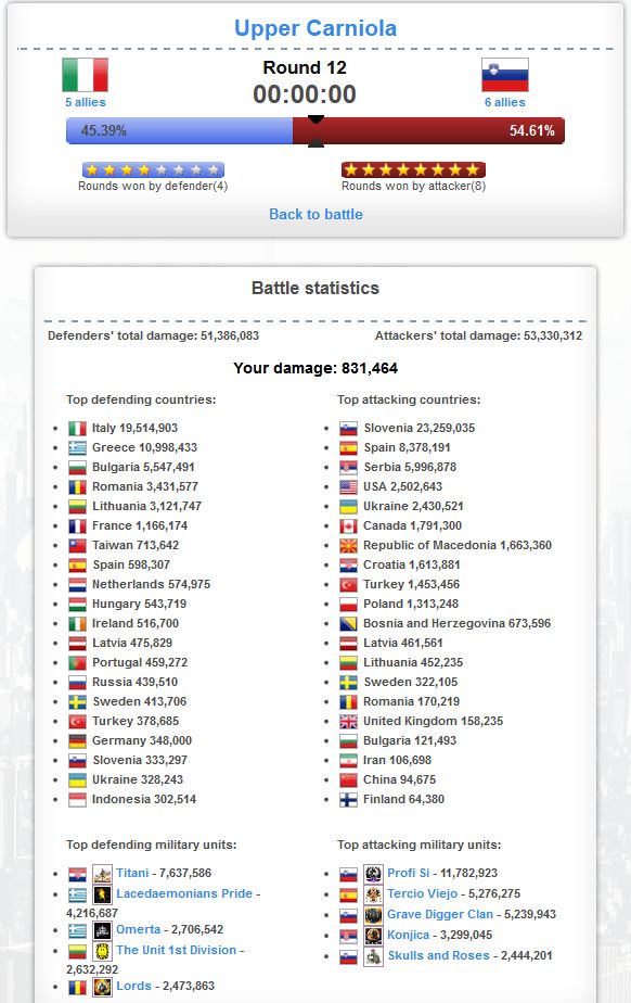 Torej resnica je malce težja kot samo prazne besede. Res je da sem prvi predsednik, ki je izgubil prav vse regije vendar pa je to bolj kot ne nujno zlo da obdržimo vsaj te zaveznike, ki jih imamo. Tako bom samo omenil ponudbo, ki smo jo imeli da bi obdržali vse regije razen high grain, ki povezuje Litvo z ostalim balkanom. Ponudba se je glasila: Slovenija mora plačati 50g Italiji in tako se vojna med njima prekine (Italija vrne slovenske regije), in hkrati Slovenija NE sme več pomagati svojih zaveznikom proti Litvi (in tako pridobi nazaj vse regije razen tiste ki povezuje litvo z ostalim delom). Tako to je bil predlog, ki pa ga je nažalost NE mogoče sprejeti Če bi takšen predlog sprejeli bi namreč izdali prav vse zaveznice in tako ostali popolnoma sami, prav tako pa ne bi vedli kako dolgo bi ta dogovor dejansko veljal