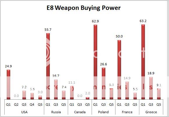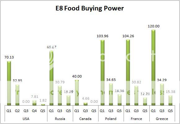 This information is under construction, basically, this is the amount of goods able to be purchased per day on a local salary from local markets. For example, a citizen working in their own country as an E8 econ level, these graphs show the amount of food or weapons one could buy per day based solely on daily wages. Smaller countries have or had incomplete data for some items.