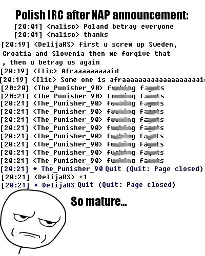 Dodatkowo, myślicie ze nasi sojusznicy są tacy wspaniali? Nie dość ze nam nie pomogli obronić stolicy, to ani razu nie pojawili się na IRC chociażby po bronie czy cokolwiek. No ale po NAP-ie nagle wszyscy znaleźli czas dla sPolski: