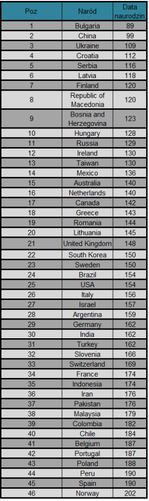 Zacznijmy od dnia narodzin (policzyłem to przy pomocy siły dzielonej na ilość obywateli danego kraju z uwzględnieniem tego że przyrost siły maleje po miesiącu trenowania)