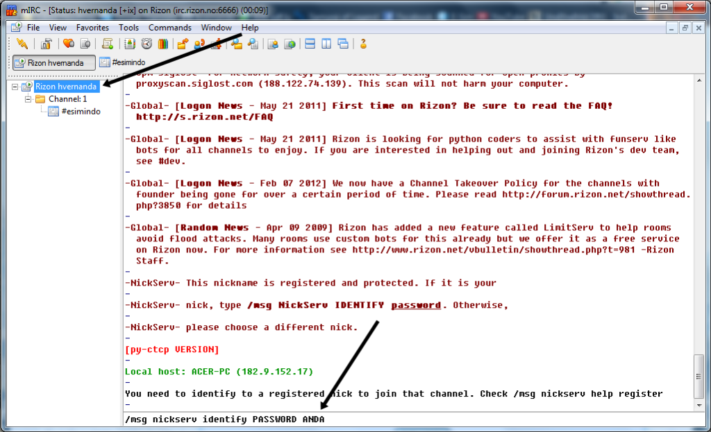 9. Tunggu sampai konek dan sampai Rizon Servernya meminta "Channel". Sperti gambar