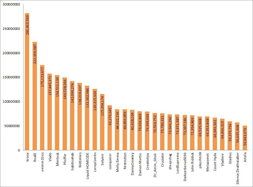 The Doors is way ahead in the lead having ~60 million lead over the second player in the Top 30, who is ME . Furthermore, you can see that The Doors has done ~5.5 times more dame in his lifetime than Artela_ who's in 30th place.