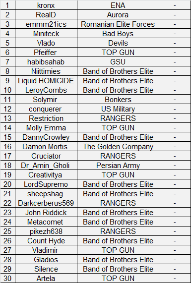 Which shows that barely in the lead making more damage than The Doors and conquerer (who take second and third places respectively) is ME!!! Yet, the most interesting thing about this week is that a total of four players didn't fight: Miniteck , Restriction , Cruciator and Abernathy . I hope they're not planing on leaving the game as USA already lost quite a few players since the new server and loosing more won't make things better, especially when we're under Polish rule ;/.