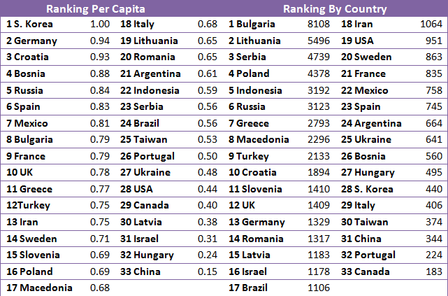 I will just highlight from the Ranking really Deserved places: Bulgaria, Russia, Poland, Croatia and more or less UK. As they have pretty high Population but still achieved to get to one of the High Spots.