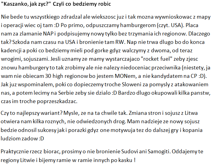 Od samego początku gry jesteśmy przeciwko Litwie. Największe bitwy w 80% były robione miedzy nami. Tony emocji przy odzyskiwaniu niepodległości (kilka razy) i przy kasowaniu/utrzymywaniu Litwy. Ale jak sami widzieliście nudno się robiło ciągle RW dainava, dainava. Podpisaliśmy wiec NAP i wszystko było ok ale sytuacja się zmieniła.