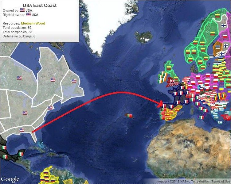 Then in the Early hours of the day America attacked the French controlled Spanish Region of Galicia. The battlefield is raging on with the French side currently winning by a slight margin.The USA is also fighting a Resistance war in Alberta in the Canadian regions and France is too in Castile Leon,and by the looks of it Spain wont be fighting for itself but rather for France. All this happened right after the the French have declared that they will conquer the so said "New France" for themselves. Battles will be fought and this war will prove to be a game changer in the World.