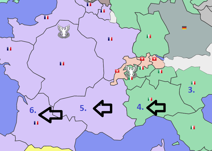 Druga etapa našeg pohoda bi trebala da bude prelazak preko Italijanskih regija i dolazak do Francuske. Neophodno je da se pređe preko Italijanske regije Lombardia Piemonte i zatim po objavi rata Francuskoj, napad na Lombardia Piemonte i Southwestern France. Bilo bi dobro da se napravi privremeni kamp u Bern-Valais u slučaju da nešto krene po zlu.