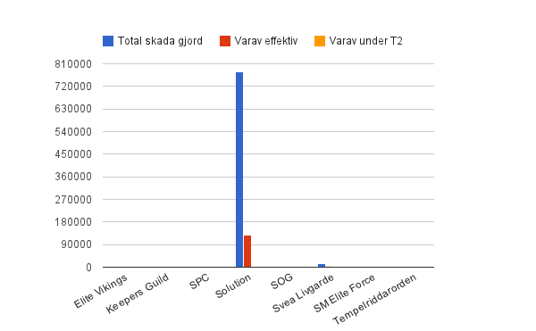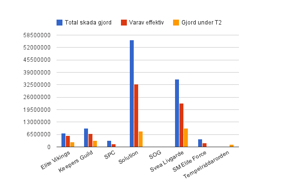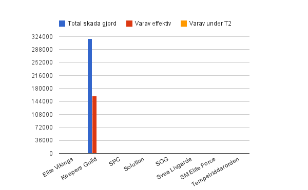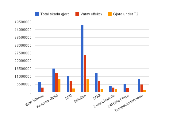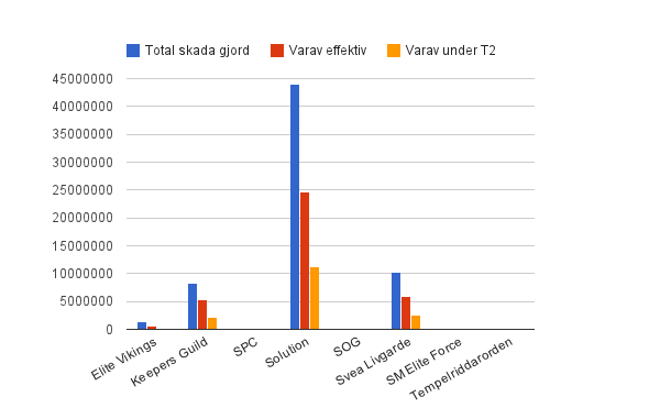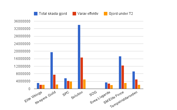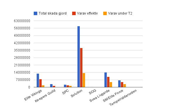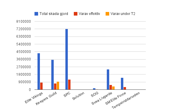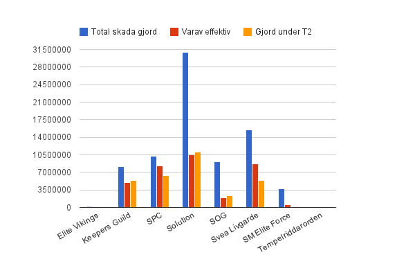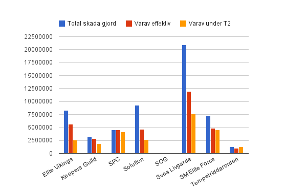 Staplarna avser total skada gjord, uppdelad på MUs. BLÅTT fält visar total skada gjord. RÖTT fält visar mängd effektiv skada gjord och det ORANGEA fältet visar mängden skada som gjordes under T2 (varje omgångs sista två minuter). Om inga röda fält finns, gjordes ingen effektiv skada och samma sak med orangea avseende T2-skada.