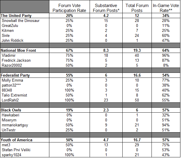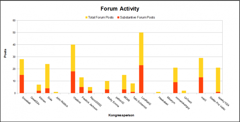 Now what does all this mean? Participation in formal voting is a good baseline of Kongress activity, as all Kongresspeople are alerted in-game that a vote is occurring on the forum. We held four votes on topics over the course of the month. Three didn't last 24 hours, either for time-sensitivity or because a consensus was apparent, so not everyone had a completely reasonable chance to sound off. Regardless, the association with activity is valid.